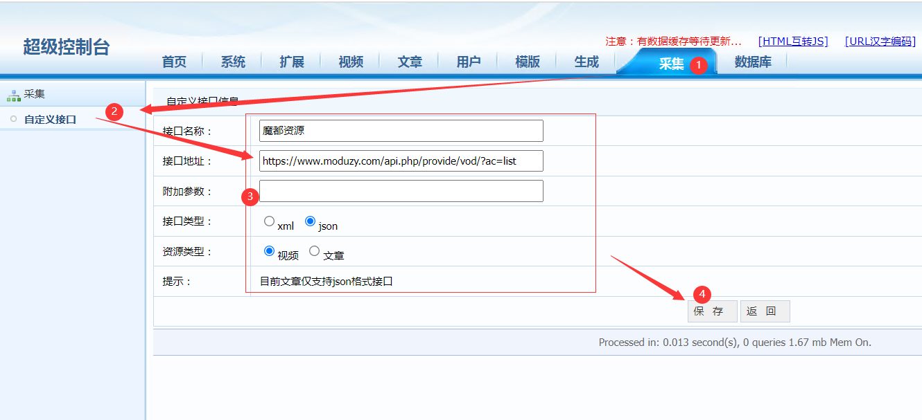 请按以下步骤进行:依次点击【采集】-【自定义接口】-【添加】,然后依次操作