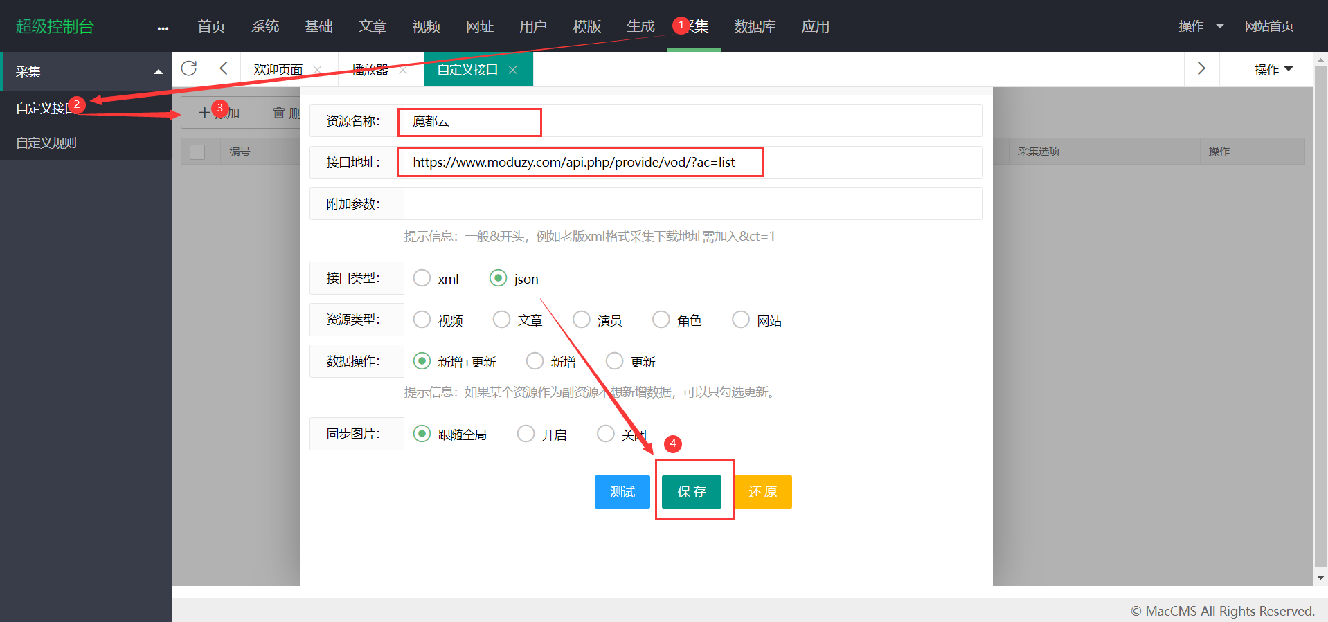 请按以下步骤进行:依次点击【采集】-【视频资源库】-【添加资源库】,然后依次操作