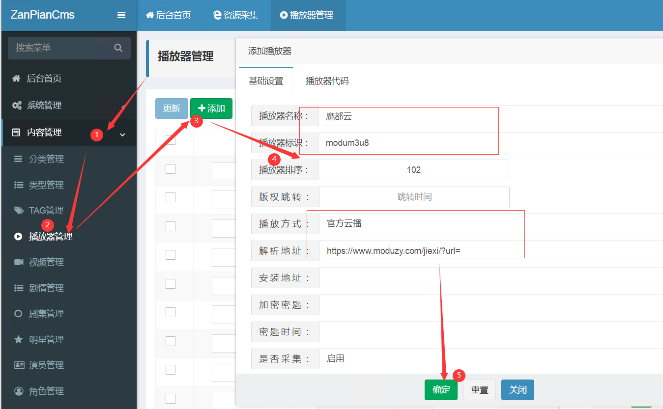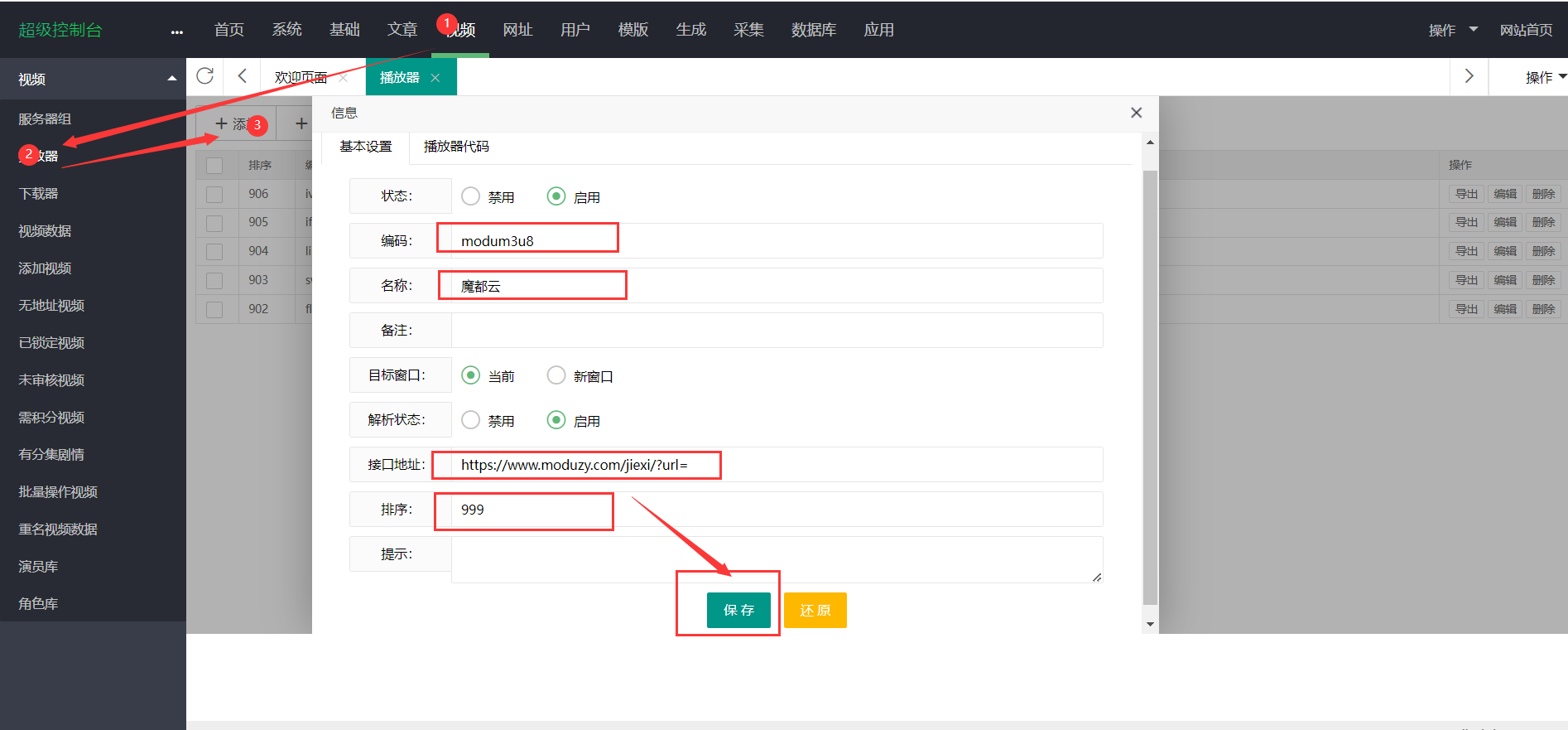需要先再网站后台添加对应的播放器,才可以实现播放 【点击下载播放器文件】