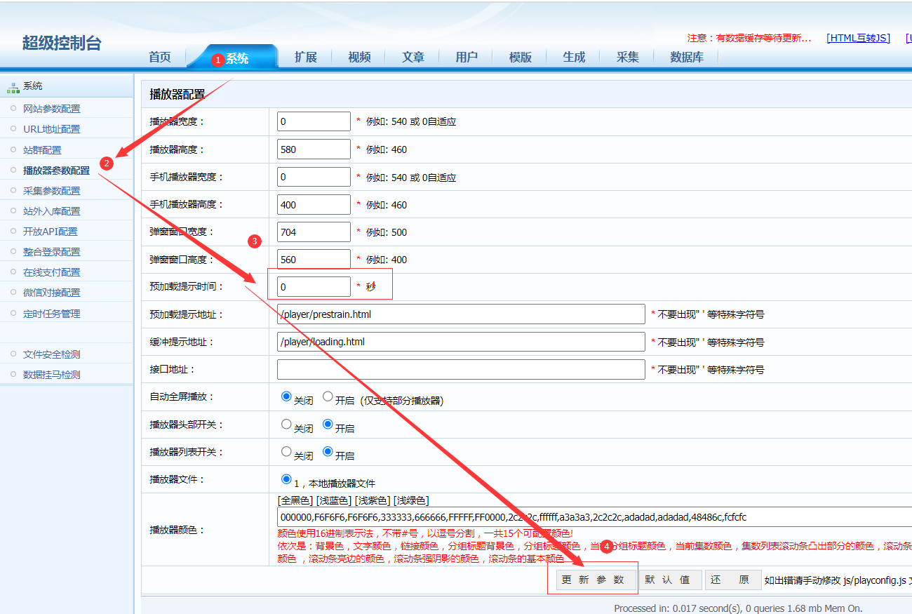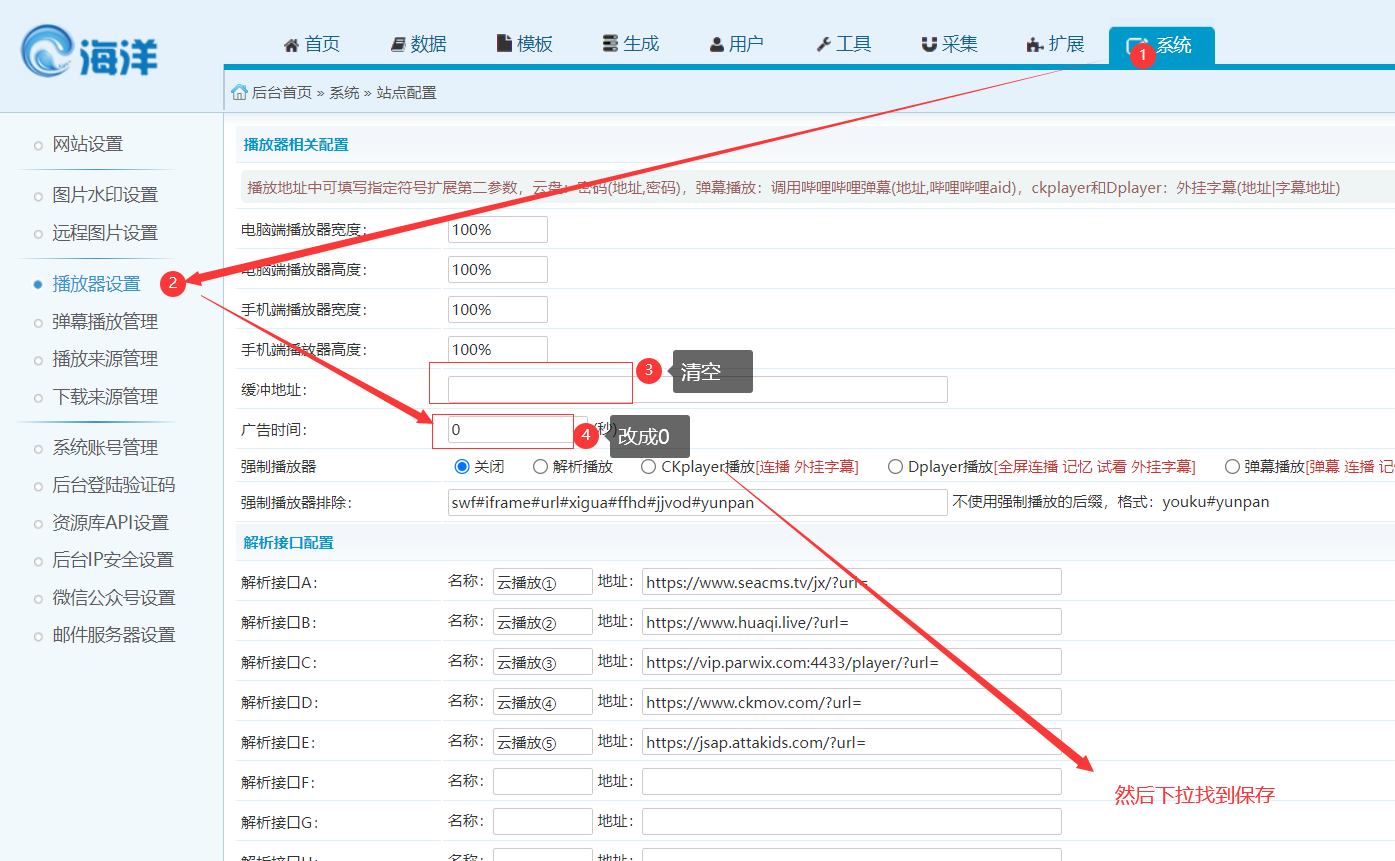 请按以下步骤进行:依次点击【系统】-【播放器配置】,然后依次操作