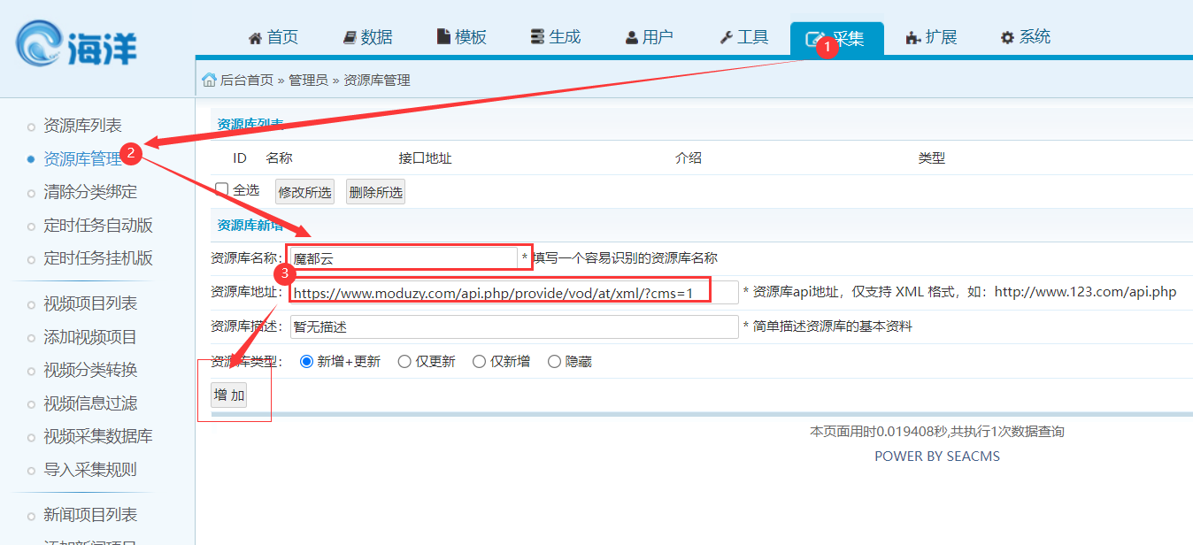请按以下步骤进行:依次点击【数据采集】-【采集管理】-【新增资源库】,然后依次操作